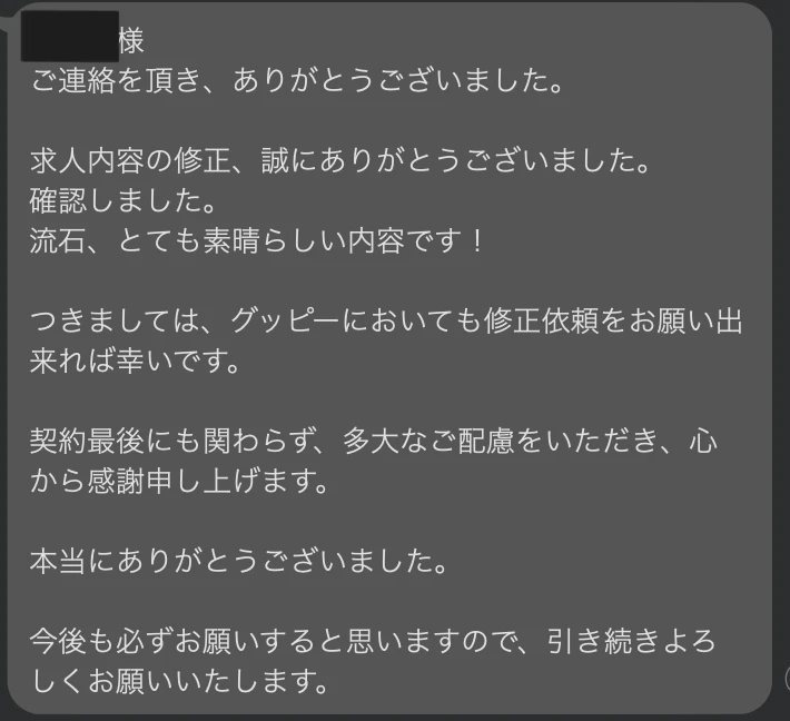 **さんの迅速かつ丁寧な対応に心より感謝申し上げます。